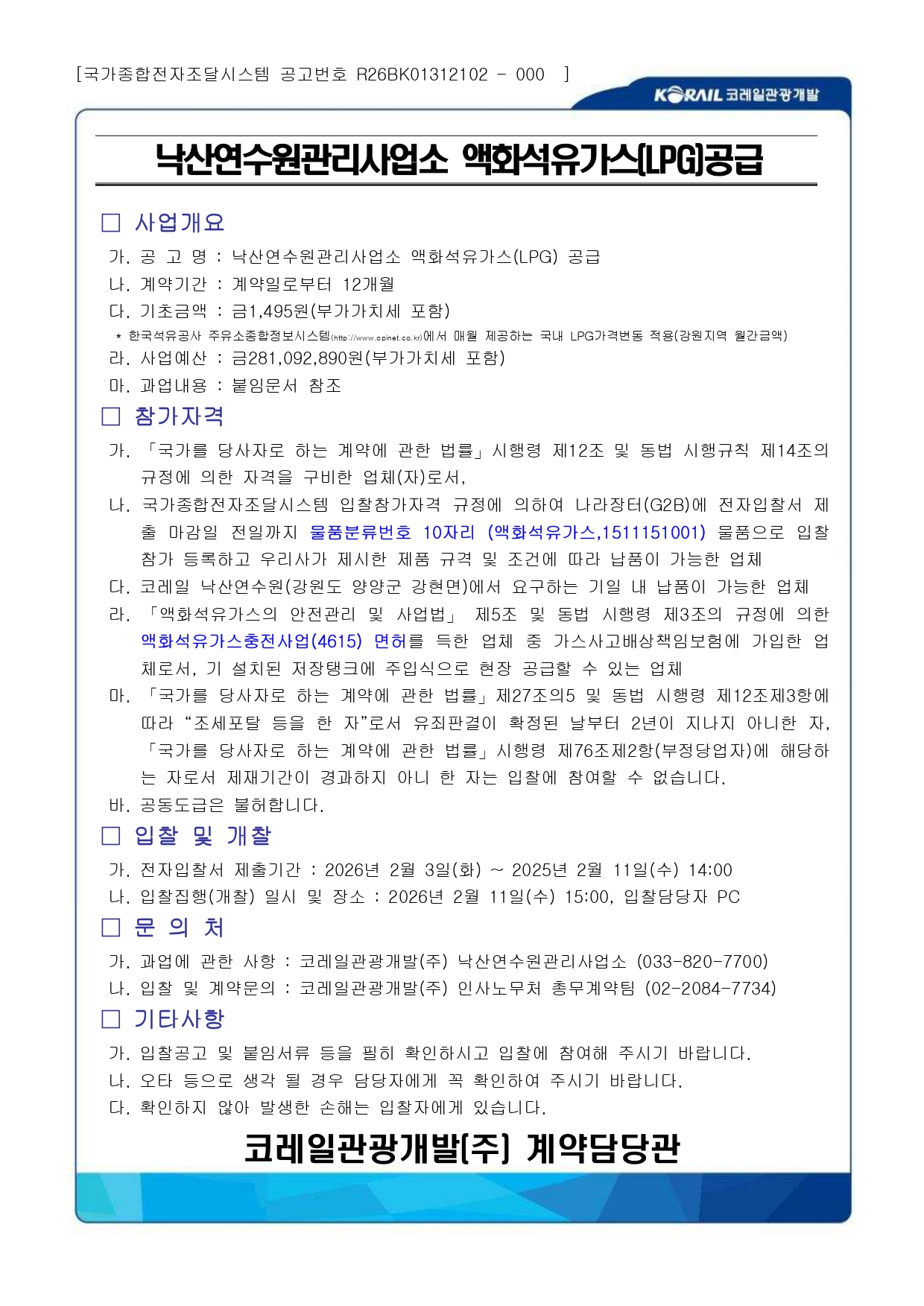 [°ø°í Á¦2026-03È£] ÄÚ·¹Àϰü±¤°³¹ß(ÁÖ) ³«»ê¿¬¼ö¿ø°ü¸®»ç¾÷¼Ò ¾×ȼ®À¯°¡½º(LPG)°ø±Þ